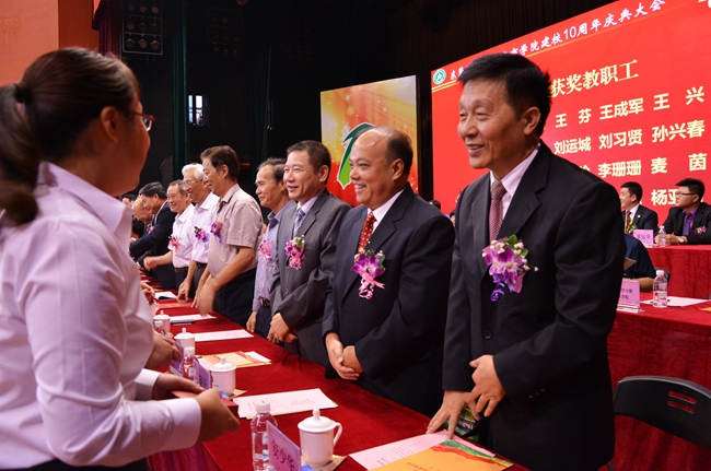 上午10时,我院十周年华诞庆典大会在综合馆隆重举行。庆典会场庄重热烈,欢歌笑语,与会者洋溢着喜悦幸福之情。