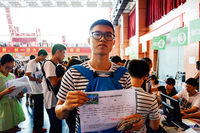 一位穿着黑白条纹衣服、戴着黑圆框眼镜、背着蓝色书包的高个子男生显眼的站在报到入口处,等待综合馆开放。他叫陈晓斌,是城环系土木工程专业的2015级新生,来自珠海,自己独自前来学校报到。