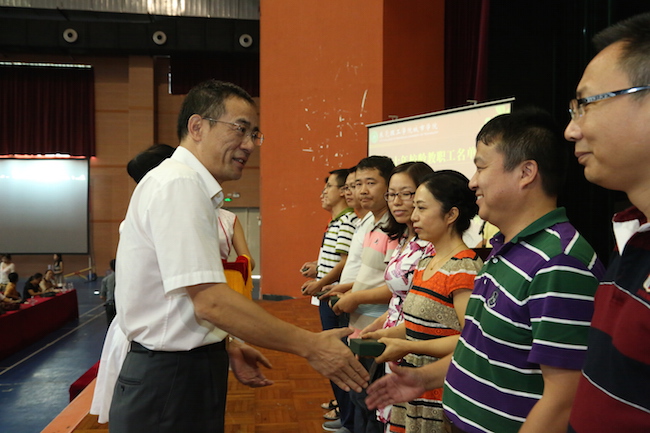 大会首先对获得学院2014-2015学年度“教书(管理、服务)育人先进个人”、“教工十佳”、“优秀辅导员、优秀班主任”荣誉称号的教职工分别进行了表彰,接着向52名十年校龄的教职工颁发纪念奖章。
