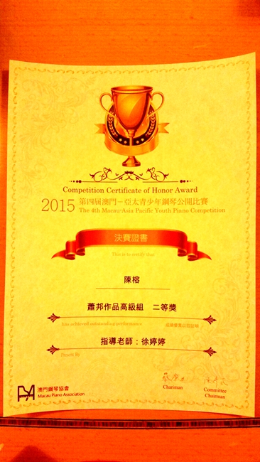 今年暑期在澳门举行的第四届澳门—亚太青少年钢琴公开赛上,我院艺术系2013级音乐表演班陈榕同学获得了决赛肖邦作品高级组的二等奖。同时,陈榕同学还参加了在香港举行的2015“肖邦纪念奖”香港-国际钢琴公开赛,并获得了二等奖。