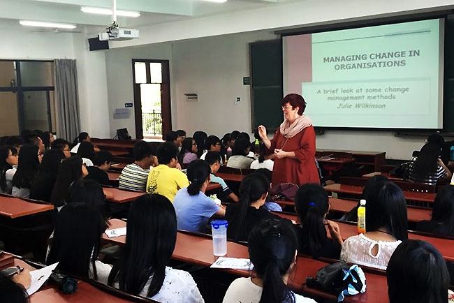 中午时分,Julie博士还为管理系学生做了一场主题为“为什么管理变革如此困难”的报告。Julie博士语言幽默风趣、亲和力强,受到同学们的欢迎,引来不少同学与其合影留恋。