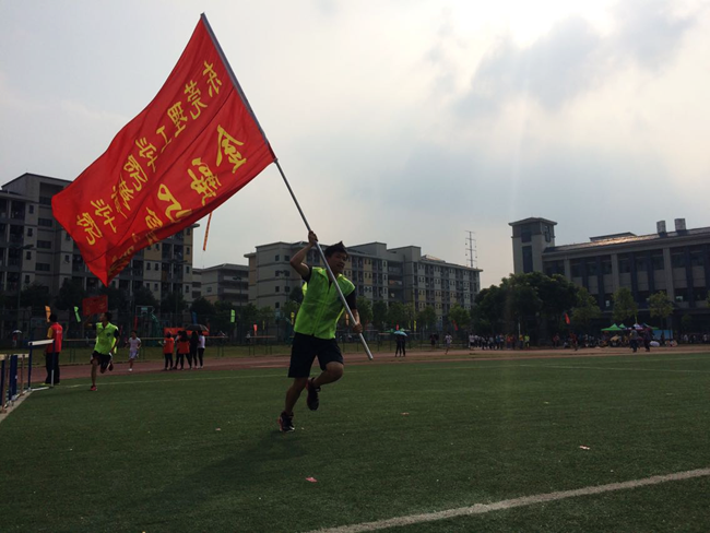 就在金贸系健儿距离终点只有半圈之遥时,观众中的一个身手矫健的男生,身穿红色的运动服,手扛大旗沿着跑道给近金贸系健儿陪跑。现场顿时沸腾起来,只见金贸系健儿用尽全力向终点冲去,最终在“金贸系加油!”的呼声中第一个冲过终点线。(胡越余)