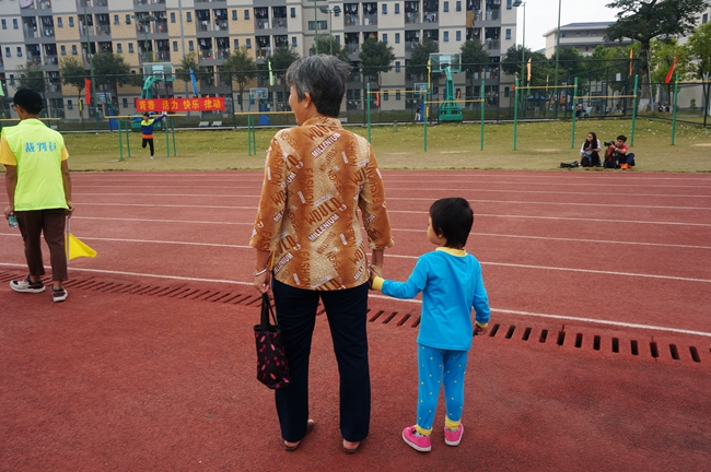 从运动场的这头走到那头,大手一直紧紧地牵着小手,从未松开,满满的温情。(黎佩珊)