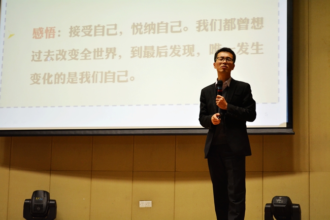 讲座上,徐川老师还借助他个人丰富的人生经历,分享了他自己求学路上的各种经历,在向大家展示现实生活问题的同时,又注入了满满的正能量,教导同学们懂得去学会“接受自己,悦纳自己,认识自己,超越自己”,“勇于尝试,勇于挑战”!在谈及到人的“自信”问题时,徐川老师寄语同学们:“自信的根本在于‘信自’,当全世界都不相信你时,自己也要相信自己”,要“在不适合自己的土壤里也能茁壮成长”!
