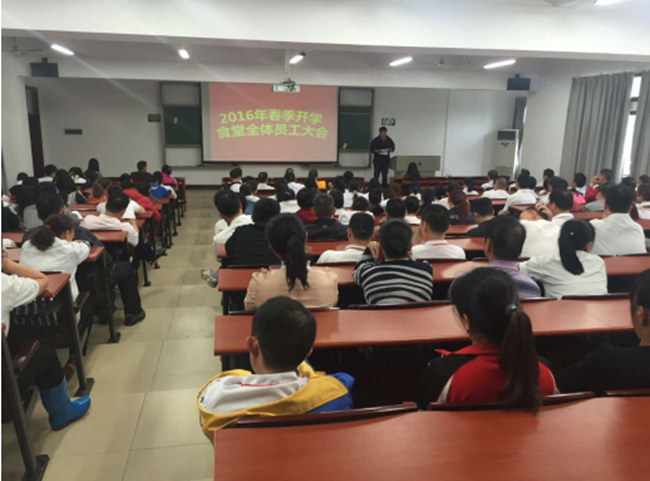 3月4日,我院2016年春季新学期食堂工作大会暨食堂工作人员培训会在阶梯教室7b211举行。 饮食服务中心全体人员参加了会议。