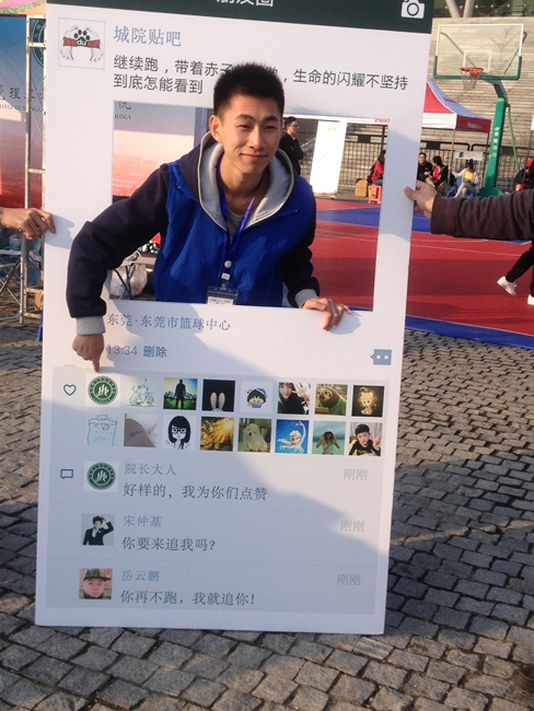 若留意便会发现,“莞马”城院摊位处摆放着一个泡沫胶质材的“相框”,小伙伴们都争着与“相框”合照,连老师也不亦乐乎。