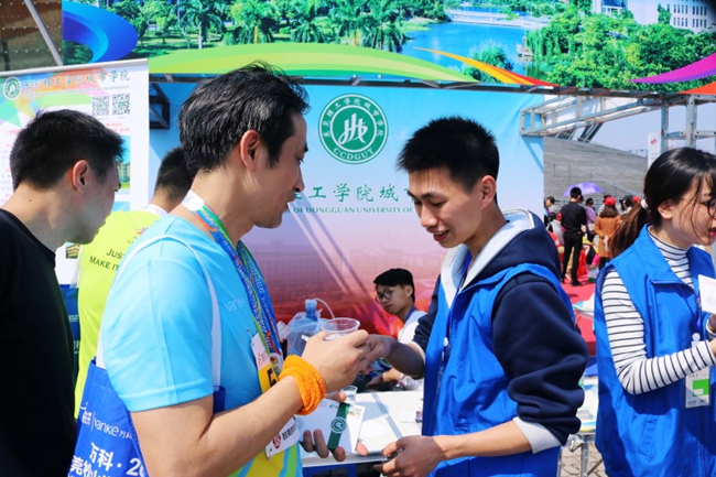 这段对话重复不断地演绎在摊位前面的过道上。每当选手们冲刺终点后筋疲力尽地走过,城院摊位的小伙伴们就会赶紧递上一杯水,为了补充运动员损耗的体力,小伙伴们还特地在水中加入了葡萄糖,更有贴心的同学将风油精都准备好了。
