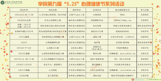 据悉,本次专题心理讲座是我院第九届5?25心理健康节系列活动之一。今年5?25心理健康节我院共推出12项心理精品培育项目,活动形式涵盖心理讲座、原创心理作品比赛、心理游园活动、心灵剧院等等,旨在通过心理活动提升我院大学生的心理素质。