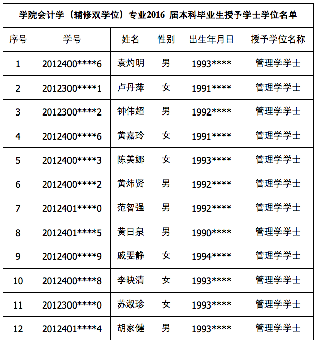附:学院会计学(辅修双学位)专业2016 届本科毕业生授予学士学位名单
