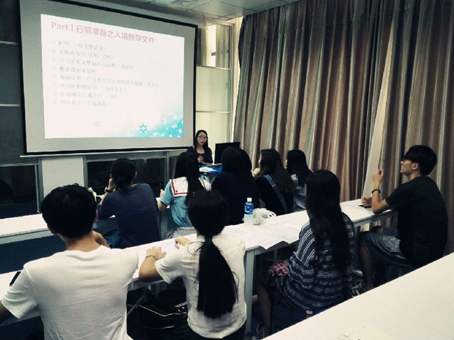 国际交流中心夏泉源副主任向学生们介绍了国外大学对于学生的基本要求和国内外大学学习方式的差异,勉励学生对自身的学习提出更高的要求,尽快适应国外的求学环境,做好海外学习前的准备工作。国际交流中心项目负责老师向大家简要介绍了学院出国留学项目的办学情况,分享了本次学生出国留学的录取情况和成果,以及对学生行前准备、出入境流程、抵达学校报道流程及相关事项、以及留学签证续签等做出了详细的指导和说明。
