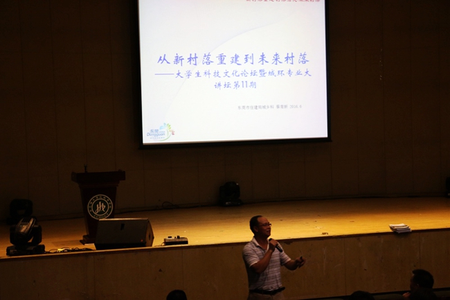 有近30年从业经验的东莞市住建局城乡科科长蔡育新作为活动专家参与了此次设计比赛的动员大会,并进行了主题为《从新村落重建到未来村落》的专题演讲。他以活化东莞村落为切入点,挖掘东莞古村落和现代社区中的绿色建筑元素,并结合地方人文情怀和专业化理论,向参会师生讲解了“以旧村落文化遗存、元素为纽带的内环系统+以外来楼盘新移民、承载外来新元素和商业元素的外环系统”的绿色新社区村落构建理念,现场掌声不断。
