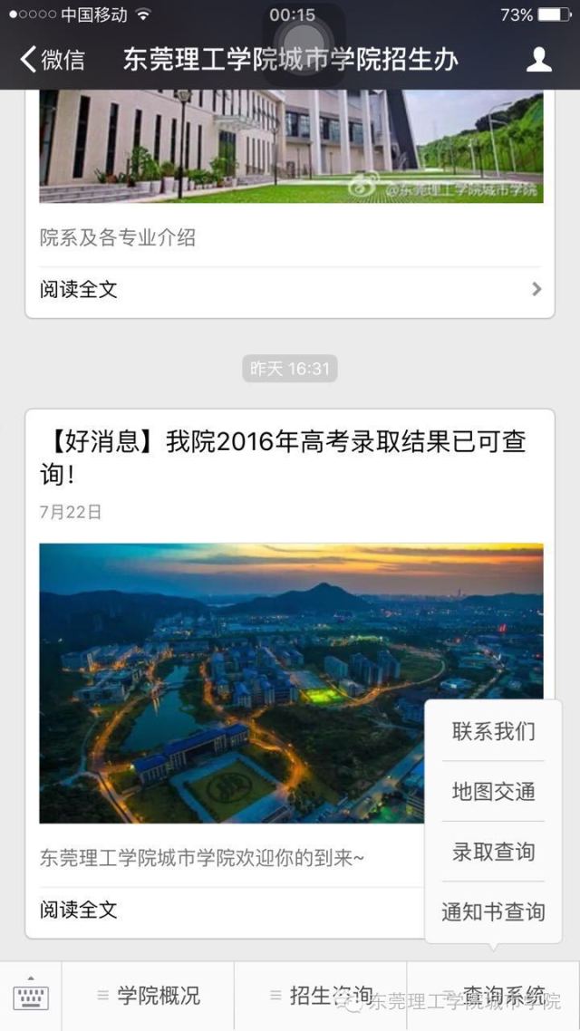 第二步,请打开公众号界面,点开下来菜单中的录取结果查询。