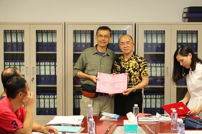 图为王院长为钟明仁博士颁发聘书
