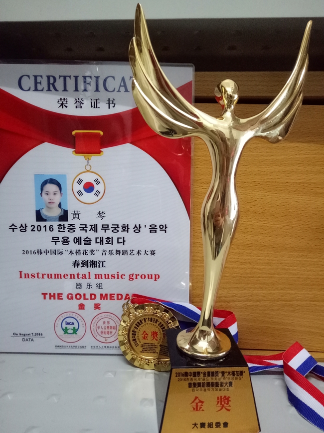 暑假期间,我院艺术系2014级学生黄棽在韩国举办的2016韩、中国际“木槿花奖”音乐舞蹈艺术大赛中,荣获器乐组古筝独奏金奖。