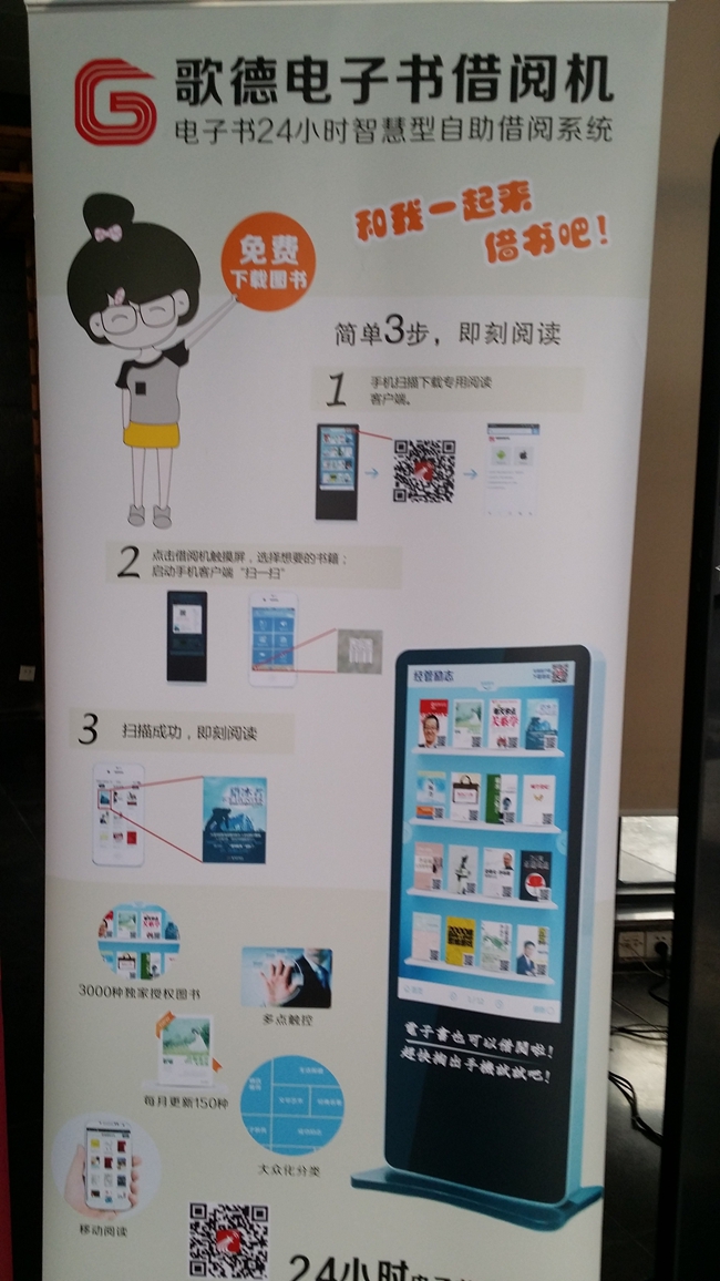 据悉,此款借阅机内置2000本授权电子图书,每个月还将保持100本图书更新,涵盖健康生活、文学名著、少儿教育、小说传记、社会法律、经管励志、文化艺术、科学技术、文学艺术、历史地理、哲学宗教等多个方面。它可以帮助读者轻松简单地实现电子书的借阅。读者在智能移动设备上安装歌德电子书阅读器或超星移动图书馆APP后,用手指轻轻点触显示屏上的图片,看到自己喜欢的图书,只要拿出手机轻轻扫描一下对应的二维码,就可以将图书下载到自己的智能手机带走,方便快捷,还没有借阅数量的限制。