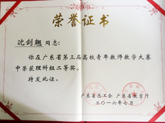 来自广东省第三届高校青年教师教学大赛的好消息,我院沈剑翘老师荣获该项赛事理科组二等奖,同时我院荣获大赛优秀组织奖。