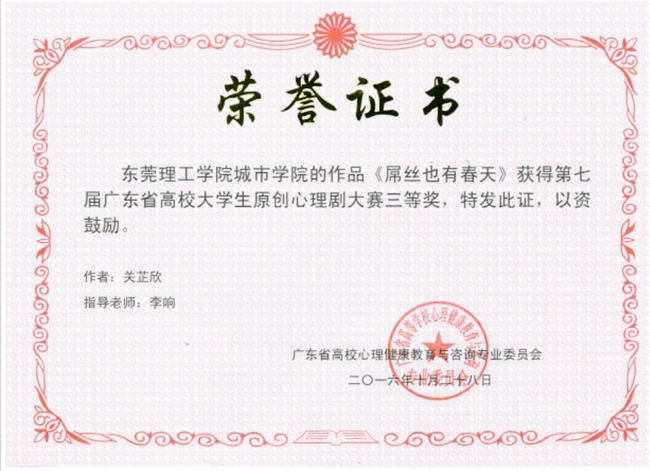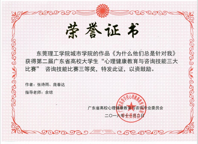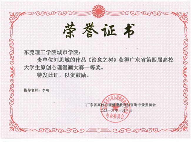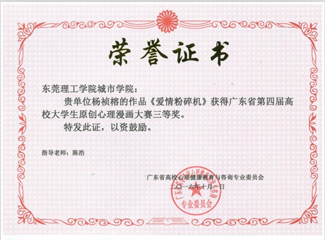 近日,记者从广东省高校心理健康教育与咨询专业委员会获悉,我院多项参赛心理作品在广东省系列比赛中斩获佳绩。其中,《人际关系心理问题咨询》、《为什么他们总是针对我》作品分别在“第二届广东省高校大学生心理健康教育与咨询技能三大赛”中荣获省赛二等奖、三等奖;财经系刘思域同学的作品《治愈之树》、创意设计学院杨祯榕同学作品《爱情粉碎机》分别在第四届广东省高校大学生大学生原创心理漫画大赛中,荣获一等奖、三等奖。此外,财经系关芷欣等同学的心理剧作品《屌丝也有春天》在第七届广东省高校大学生原创心理剧大赛荣获省赛三等奖。