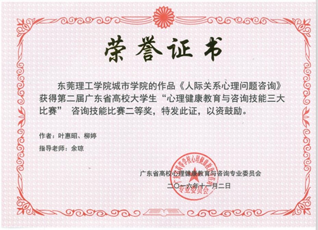 据悉,此次系列大赛是由广东省高校心理健康教育与咨询专业委员会主办,该专业委员会在省教育厅领导下负责全省心理健康教育与咨询工作。“三大”系列比赛每年举办一次,并采取学校初赛、区域中心复赛和专业委员会专家评审产生决赛奖项的办法进行评选。