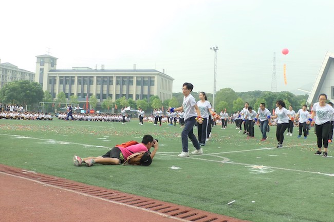 在运动会上,有这样的一群人,当大家在为比赛欢呼时,他们却在扛着沉重的机器不停的奔波着。即使是已进入秋冬时节的十一月,烈日依旧炎炎,把草地、跑道烘烤得火力十足。但他们似乎全然不觉,跪着、坐着、躺着……各种各样姿势,只为用镜头留下活力青春。