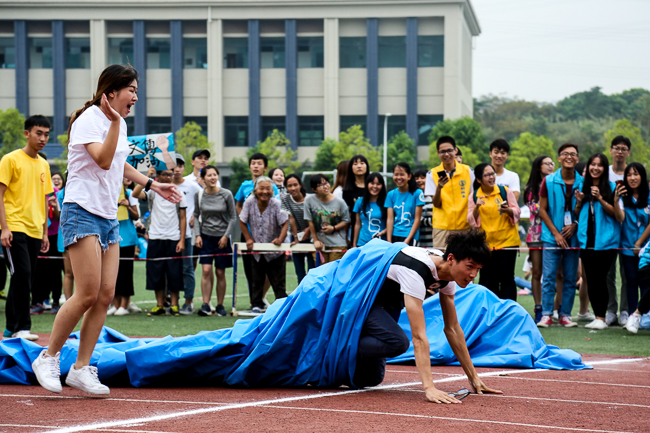比赛拉开帷幕后,在各系拉拉队的呐喊声中,选手使尽浑身解数努力向前。尤其是钻塑料带环节,面对狭窄而难于移动的塑料带,女选手没有半秒犹豫便挑战最难项,咬牙扎进通道里迅速通关接力,她们的勇猛并不亚于男生,体现了“巾帼不让须眉”的豪迈气度。
