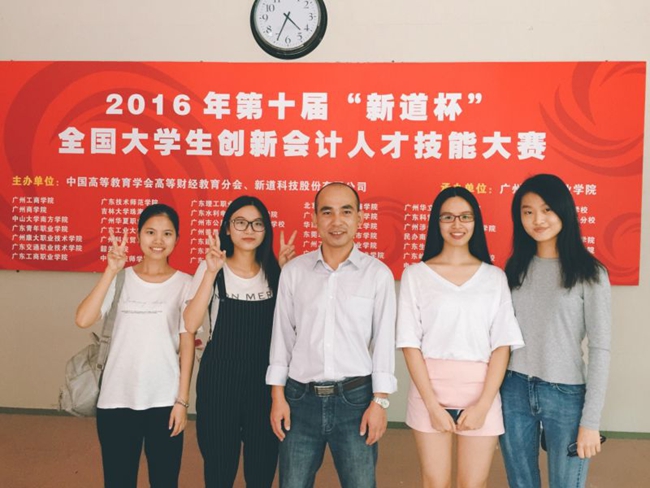 在日前举行的第十届“新道杯”全国大学生创新会计人才技能大赛上,我院财经系2013级李文珊、刘玲、何绮君、潘梓莹四名同学(指导老师:耿玉成、何文琴)在本科组竞赛中获得 “全国联赛三等奖”和“广东省联赛三等奖”的好成绩。其中,李文珊同学在个人赛中还获得个人优胜奖。