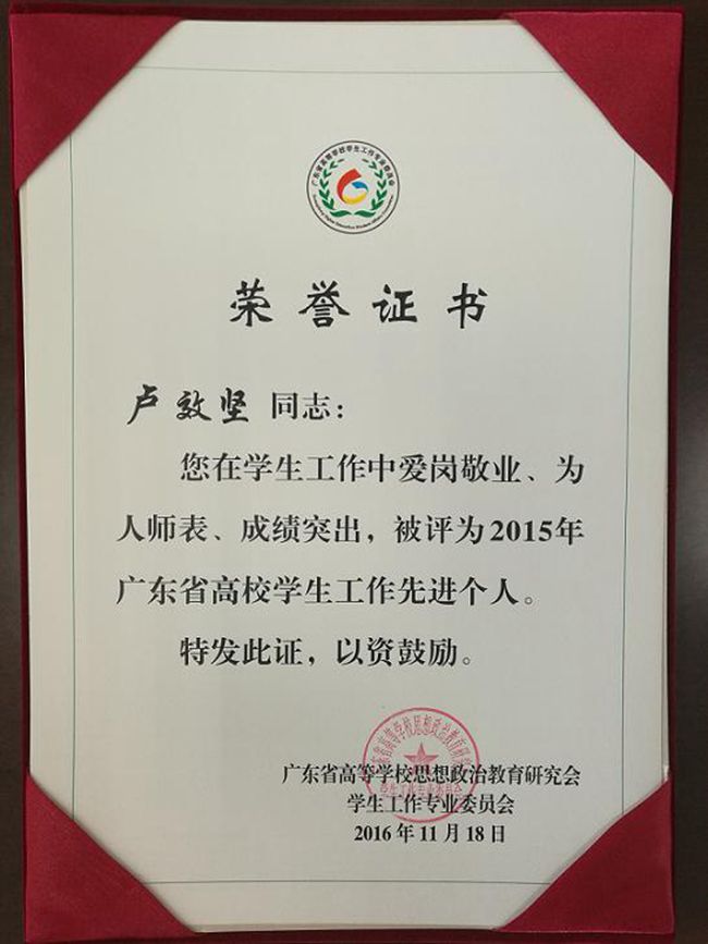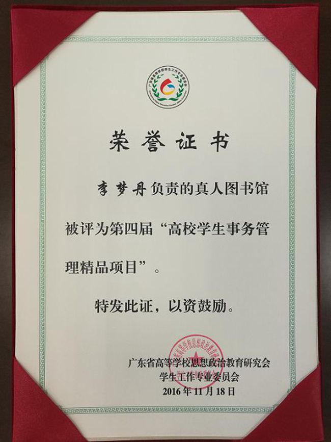 2016年12月14日-15日,广东省学生工作专业委员会年会暨高校实践育人研讨会在惠州学院举行,我院学生处处长杜鹏举参加会议。大会表彰了2015年度广东省高校学生工作先进个人、优秀团队、红棉奖及精品项目,我院学工团队喜获佳绩,其中财经系被评为“2015年广东省高校学生工作优秀团队”,管理系辅导员李梦丹负责的“真人图书馆”被评为第四届“高校学生事务管理精品项目”,财经系辅导员卢效坚被评为“2015年广东省高校学生工作先进个人”。