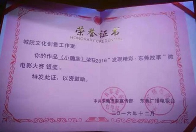 12月15日,由市委宣传部、市城市形象推广办公室主办,东莞广播电视台承办的2016年“发现精彩.东莞故事”微电影大赛的颁奖典礼在东莞电视台举行,我院创意设计学院学生拍摄的微电影《小确幸》喜获银奖。
