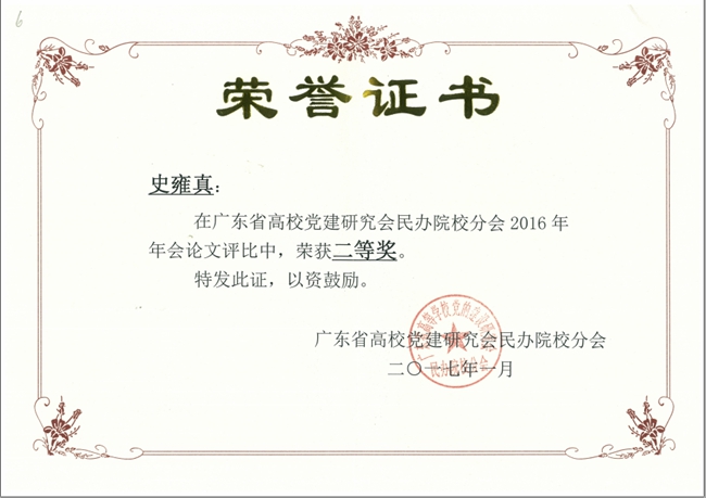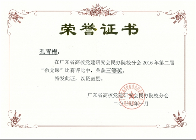 3月9日,广东省高校党建研究会民办院校分会2016年年会在广州工商学院召开。会议对2016年广东省民办高校第二届微党课比赛及高校党建研究会民办院校分会2016年优秀年会论文的获奖人员进行了表彰,我院范琪、孔青梅等同志的微党课分别荣获二等奖、三等奖,史雍真同志的论文获优秀年会论文二等奖。