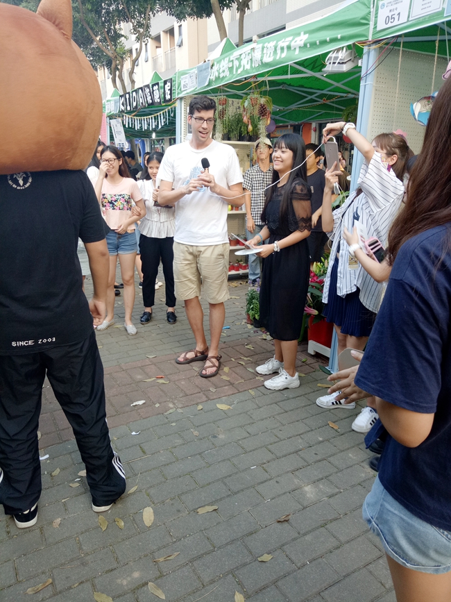 在一个杂货摊位前,一个阳光帅气的外国小哥举着小话筒,连接着手机正在进行户外直播。外国小哥不仅熟练地运用中文与摊主交流,还跟摊位前的“人偶熊”PK起了机械舞,将周围的气氛提升了一个热度。许多同学被吸引而来,争着与外国小哥拍照。