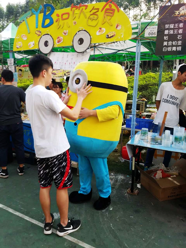 7号摊位“识饮色食”则请出近年火爆的“小黄人”揽客,连招牌都做成小黄人的样子。不得不说,小黄人作为镇店之宝确实吸引了很多人,同学们都情不自禁地上去摸一下或合照,玩得不亦乐乎。