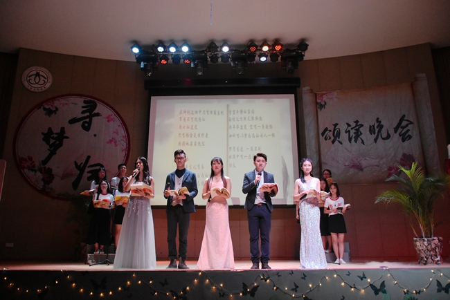 “于书中寻雅文绮韵,于梦中守月明花开。” 5月4日晚,文传系“寻梦?归”主题颂读晚会在学术报告厅精彩呈现。院长、书记王卫平,党委副书记章德胜,副院长周庆,院党委委员、院办主任杜鹏举和部门负责人,以及东莞汽车技术学校团委副书记徐汉明、快创信息科技公司总经理安伟等领导、嘉宾观看了颂读晚会。