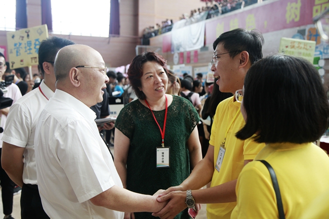 麦照容董事长来到各个报到点,与工作人员握手攀谈,询问新生报到及系部的建设情况,并合影留念。在管理系报到点,麦照容董事长握住来自祖国宝岛台湾、刚入职学院的沈圣伦博士的手,亲切询问其生活、工作情况,鼓励他安心工作。他说,大陆的经济发展将为每个人才提供广阔的发展空间。在与同样来自台湾的院长助理林江龙教授的交谈中,麦照容董事长希望他把台湾先进的教育教学经验带到学院,促进城院发展,促进与台湾地区高校的学习交流。