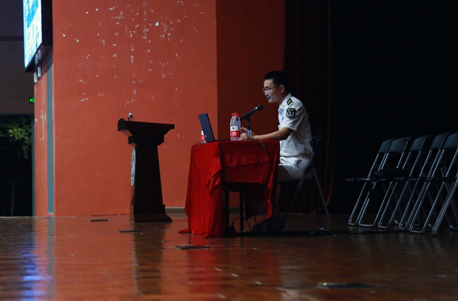 9月17日晚,新生国防安全教育知识讲座在综合馆开讲。新生军训承训部队政治教导员、军训团副团长罗强龙少校作了“前进中的人民海军”的主题报告。
