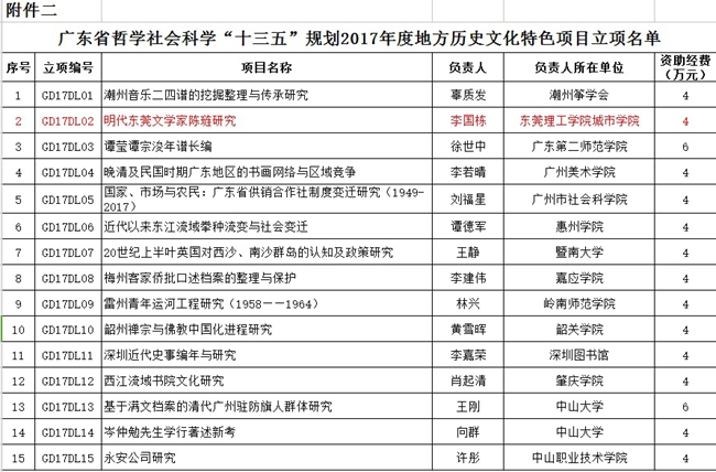 9月28日,经广东省哲学社会科学规划领导小组审批,省哲学社会科学“十三五”规划2017年度项目评审结果现正式发布。其中,我院文传系李国栋讲师申报的“明代东莞文学家陈琏研究”项目成功立项。这标志着我院在哲学社会科学规划项目申报方面实现了零的突破。