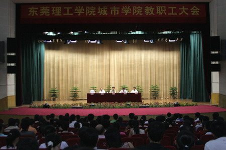 7月7日,城市学院在大礼堂召开教职工大会,传达贯彻东莞理工学院关于大运会协办工作会议精神,通报2005—2006学年度第二学期教学工作和期末考试情况。