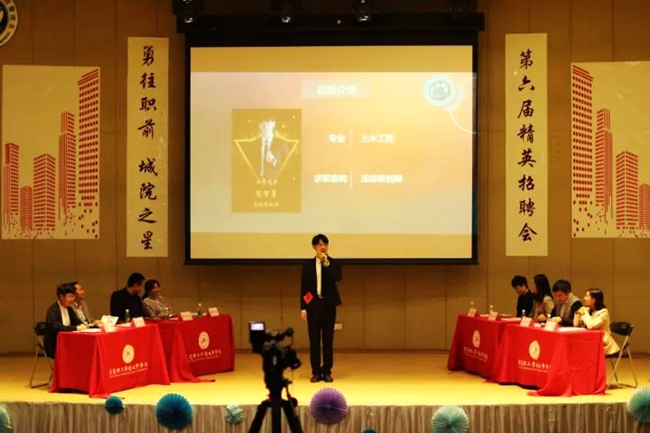 11月23日晚,我院第六届“勇往职前,城院之星”精英招聘会决赛在学术报告厅举行。院领导王卫平、章德胜、高香林、黄兢,广东鸿发教育文化集团有限公司副总经理韩春华及各企业代表、各处室院系负责人出席了本次比赛。