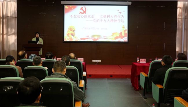 今日下午, 学院党委中心组举行扩大学习会。广东教育系统党的十九大精神宣讲团成员、十九大代表陈小花同志以“不忘初心跟党走,立德树人有作为”为主题,为大会作党的十九大精神专题报告。