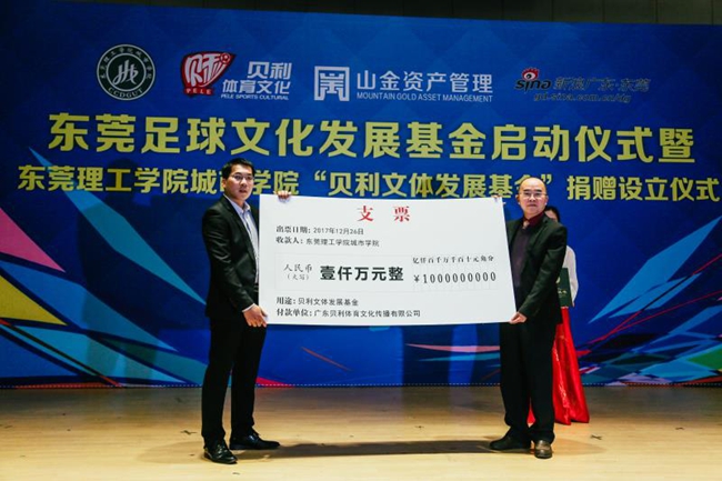 当天,东莞理工学院城市学院、广东贝利体育文化传播有限公司、东莞山金资产管理有限公司在学院报告厅举行了“东莞理工学院城市学院贝利文体发展基金”捐赠设立仪式,为校园足球文化及东莞足球文化发展掀开新的一页。