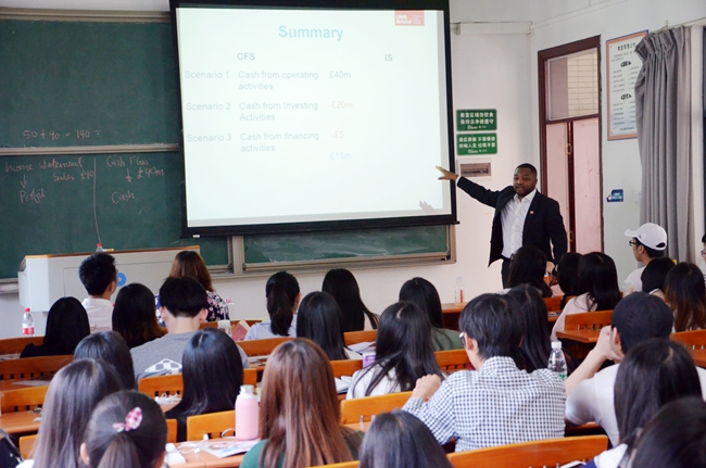 当天下午,Professor Aylwin Yafel还举行了“英国西英格兰大学金融与会计”主题知识讲座。他用轻松幽默的英语给学生们讲解浅显易懂的经济学知识,围绕实际收入和现金流的案例,阐述了企业资金运作模式,为我院学子上了别开生面的一堂课。他还鼓励大家通过城市学院的国际交流项目,增加自身国际视野和竞争力。