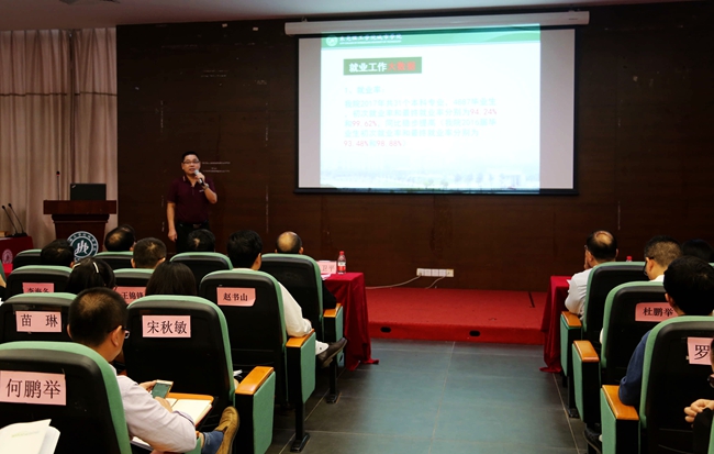 就业中心主任江小卫总结了2017年就业创业工作的特色与亮点,对2017届毕业生就业质量报告进行了重点解读。通过毕业生就业大数据,对我院招生和人才培养工作进行分析。据介绍,我院2017年共31个本科专业、4887名毕业生,初次就业率和最终就业率分别为94.24%和99.62%,同比稳步提高。