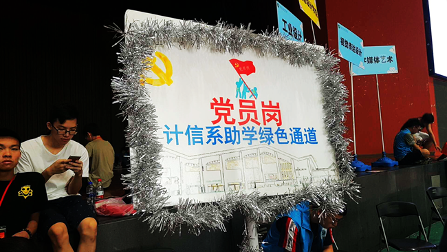在计信系的新生办学通道旁,赫然矗立着一块“党员岗”计信系绿色助学通道的牌子。