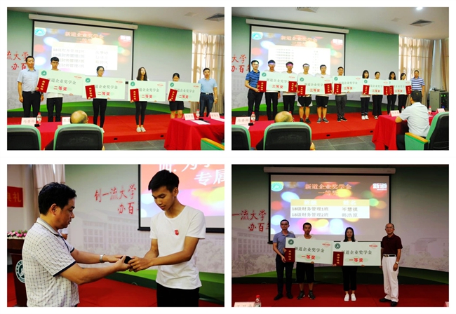 典礼上,校企双方领导为学生代表佩戴专属徽章,并为获得新道企业奖学金的新生颁发奖金及证书。其中,岑慧祺、韩浩原以高考文科507分并列荣获一等奖(奖金3000元);张梦婷等4名同学荣获二等奖(奖金2000元);周健等9名同学荣获三等奖(奖金1000元)。