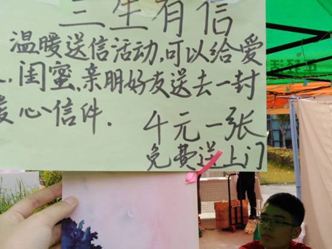 店主还设计了独一无二的“三生有信”信件,可以写封信给闺蜜、给亲朋好友、喜欢的人写上你想说的话寄送她们。在网络时代,手写的一封信更可传达心意,来一次敞开心扉、表达真诚的机会吧!写完后由店主帮你免费送上门,给“他”一个惊喜! (大学生实习记者 何芷晴)