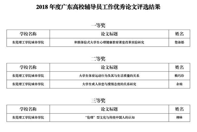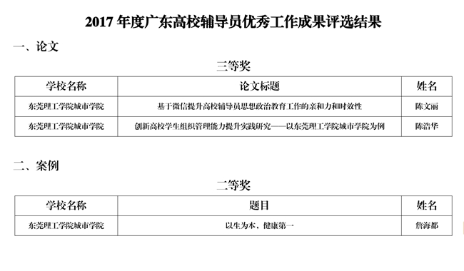 日前,从《广东省教育厅关于公布2017、2018年度广东高校辅导员优秀工作成果评选结果的通知》获悉,我院学工团队在该征集活动中共斩获了七个奖项,其中一等奖1个,二等奖3个,三等奖3个。