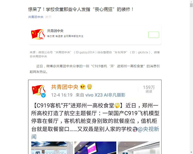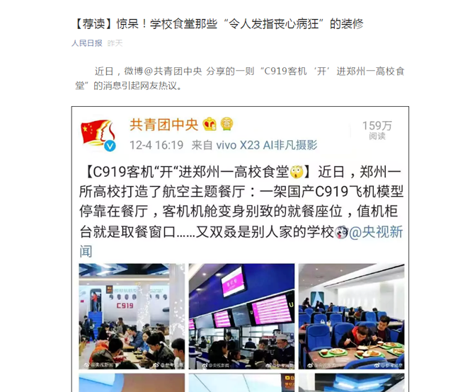 12月6日,共青团中央官微刊文发布了一批高校“高大上”的网红食堂,我院网红食堂——悦香苑三楼餐厅排列在第四位。随后,人民日报官微@共青团中央,转发了该篇报道,引起了众多媒体和读者的关注。