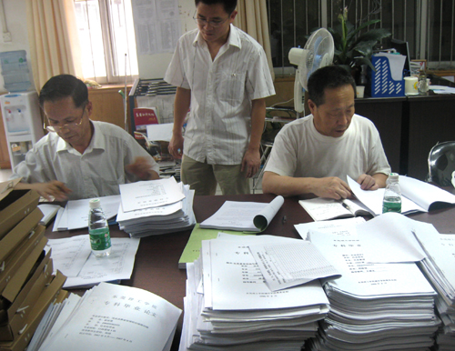 图为邵润堂教授、李先庆副教授在社科系检查毕业论文。