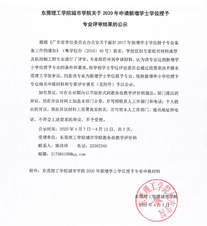 东莞理工学院城市学院关于2020年申请新增学士学位授予专业评审结果的公示