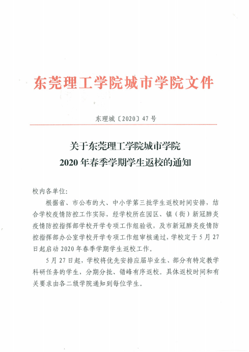 关于东莞理工学院城市学院2020年春季学期学生返校的通知