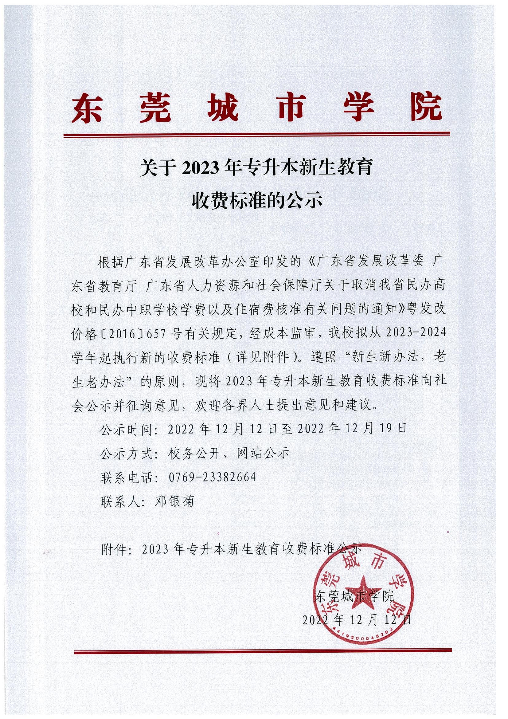 关于2023年专升本新生教育收费标准的公示