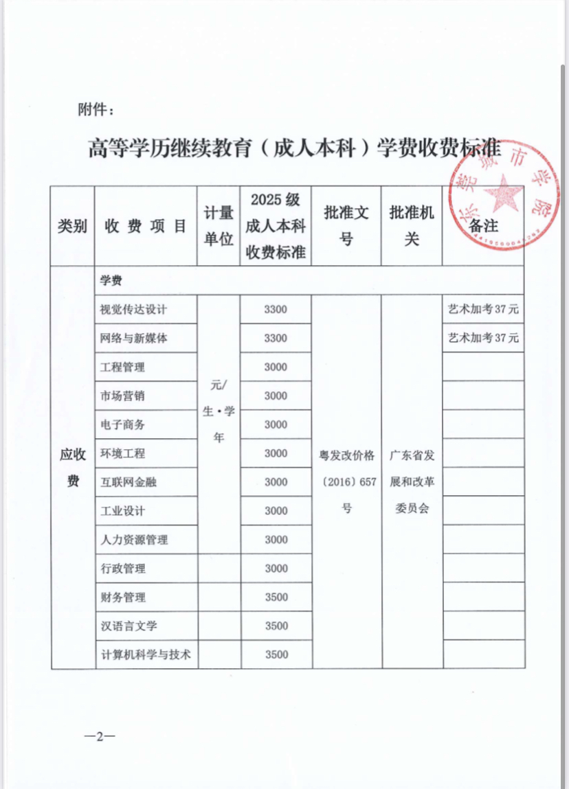 关于2025级高等学历继续教育(成人本科)学费收费标准的公示